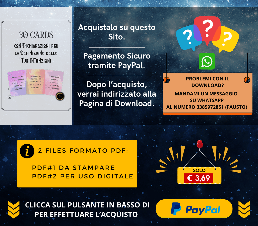 Non aspettare oltre per dare una direzione concreta ai tuoi sogni e alle tue aspirazioni. Acquista ora le 30 Carte da Stampare con Dichiarazioni per la Definizione delle Intenzioni e inizia a creare una realtà che rispecchi veramente chi sei e cosa desideri ottenere. Fai il primo passo verso una vita più consapevole e realizzata! Acquista oggi le 30 Carte da Stampare con Dichiarazioni per la Definizione delle Intenzioni e trasforma ogni tua giornata in un’opportunità per crescere e realizzare il tuo potenziale.“Dai forma alle tue intenzioni, trasforma il tuo futuro.”